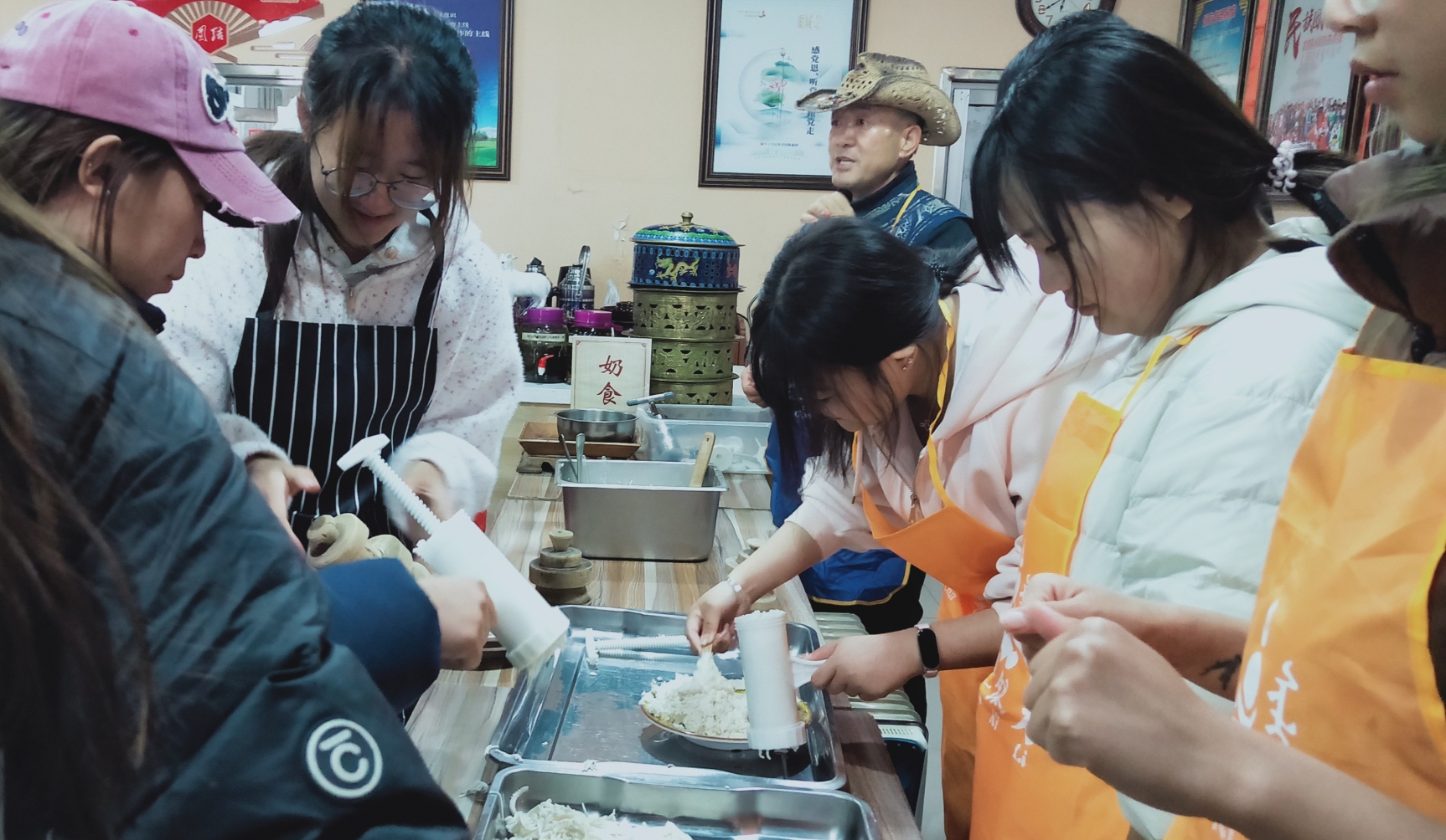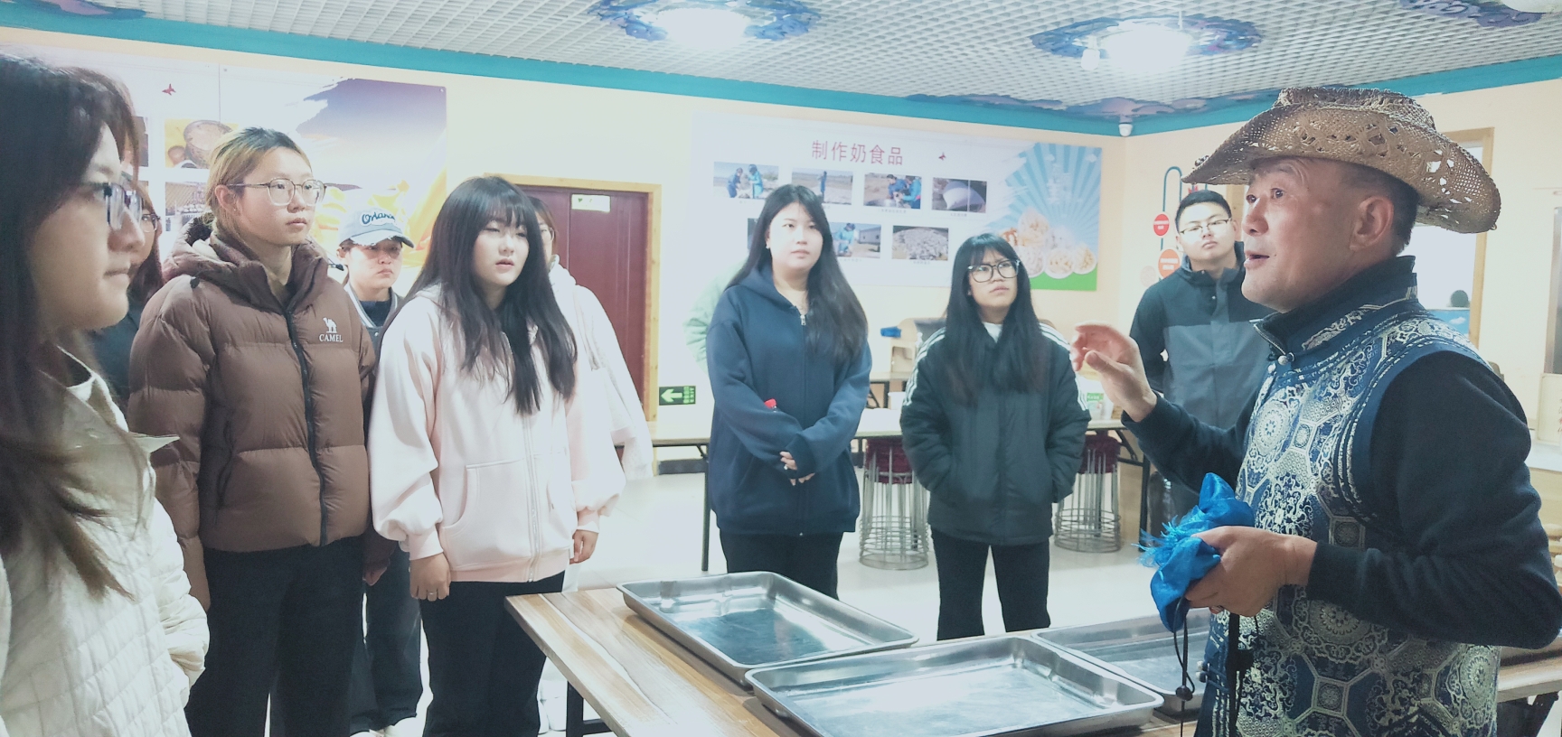 挂牌仪式结束后,结合生物技术系传统奶食品制作选修课程,师生们在非遗传承人吉人泰老师的指导下,亲手体验了鄂尔多斯奶酒酿造技艺、捣酸奶、压奶酪等制作工艺,以及蒙古迎宾礼、抛石(古仁格)等非遗项目。通过丰富多彩的实践活动,不仅让师生近距离感受了传统奶制品的非遗魅力,更以轻松有趣的方式拉近了大家与传统文化的距离,为非遗传承注入了新的活力。