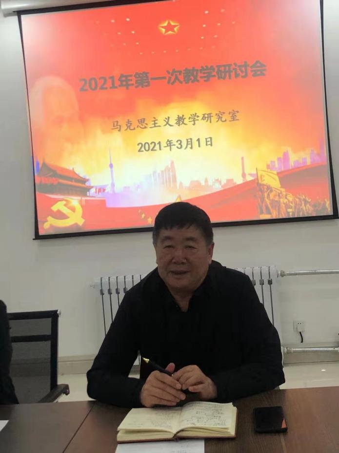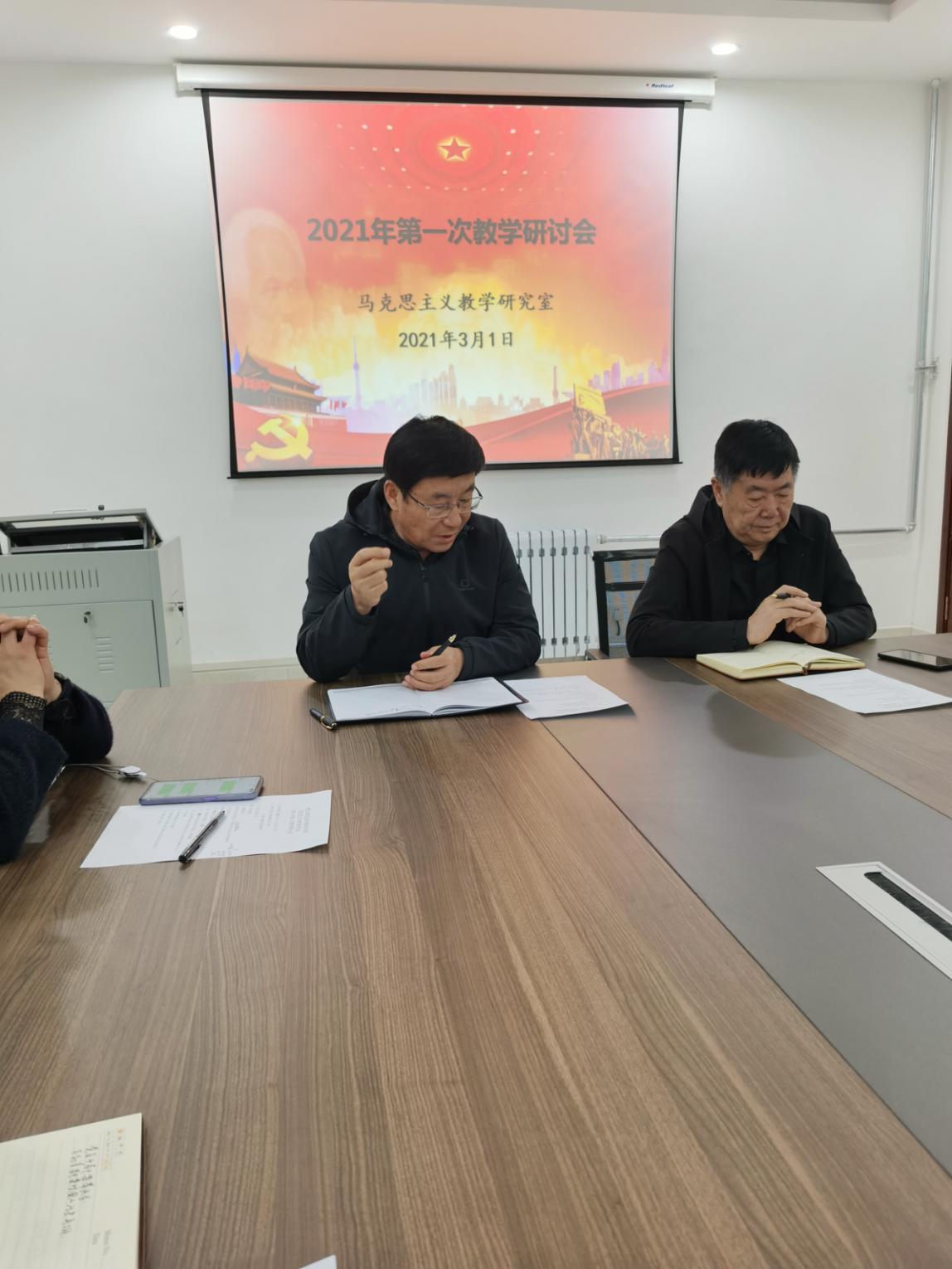 按照教育部,自治区教育厅的要求,为配合我院做好2021年第一学期开学的准备,保障思政课更好的开展,2021年3月1日上午8点,学院马克思主义教学研究室召开了本年度第一次教学研讨会,学院副院长段明光、基础部主任郭云、各备课组组长及所有专兼职思政教师参会,会议由马克思主义教学研究室负责人王东主持。