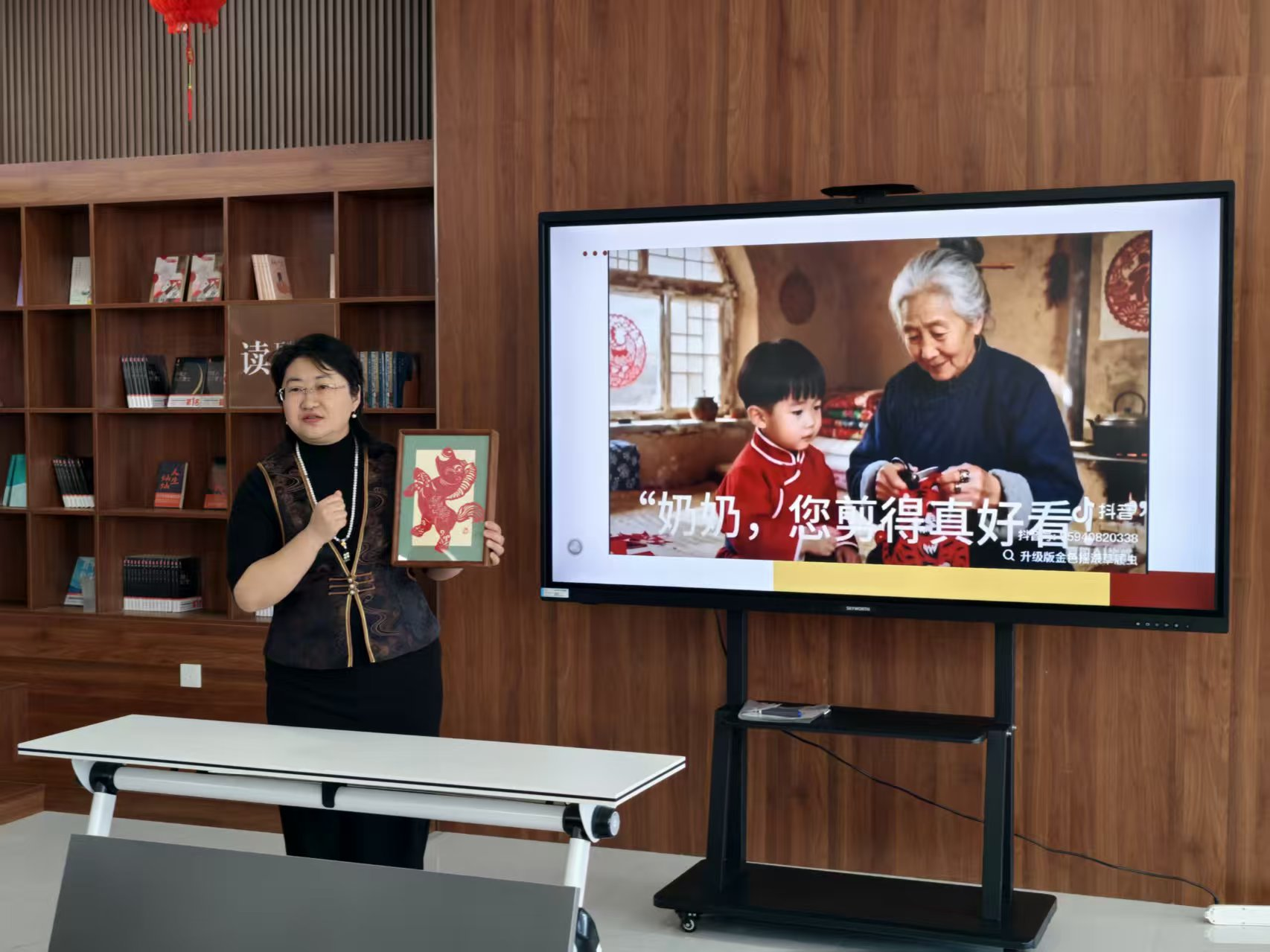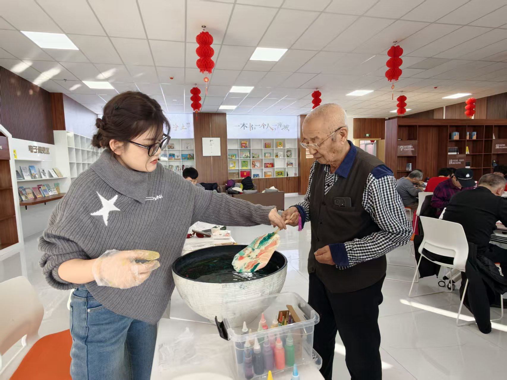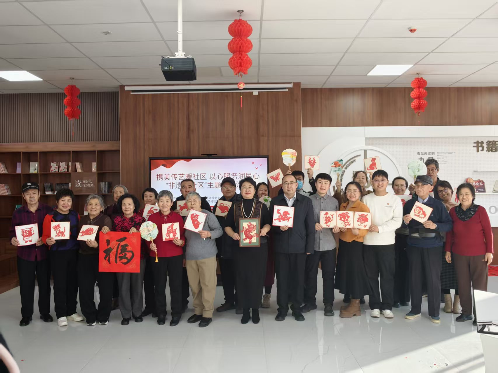 活动现场热闹非凡,基础部党总支充分发挥文化育人优势,精心组织了非遗剪纸、非遗漆扇、写春联送祝福三项特色活动。活动中,老师们耐心讲解非遗技艺的历史渊源与制作技巧,从剪纸的纹样设计到漆扇的色彩调配,一步步手把手指导居民党员群众操作。大家兴致盎然,纷纷动手创作,一幅幅栩栩如生的剪纸作品、一面面色彩斑斓的漆扇相继成型,在沉浸式体验中感受中华优秀传统文化的独特魅力。