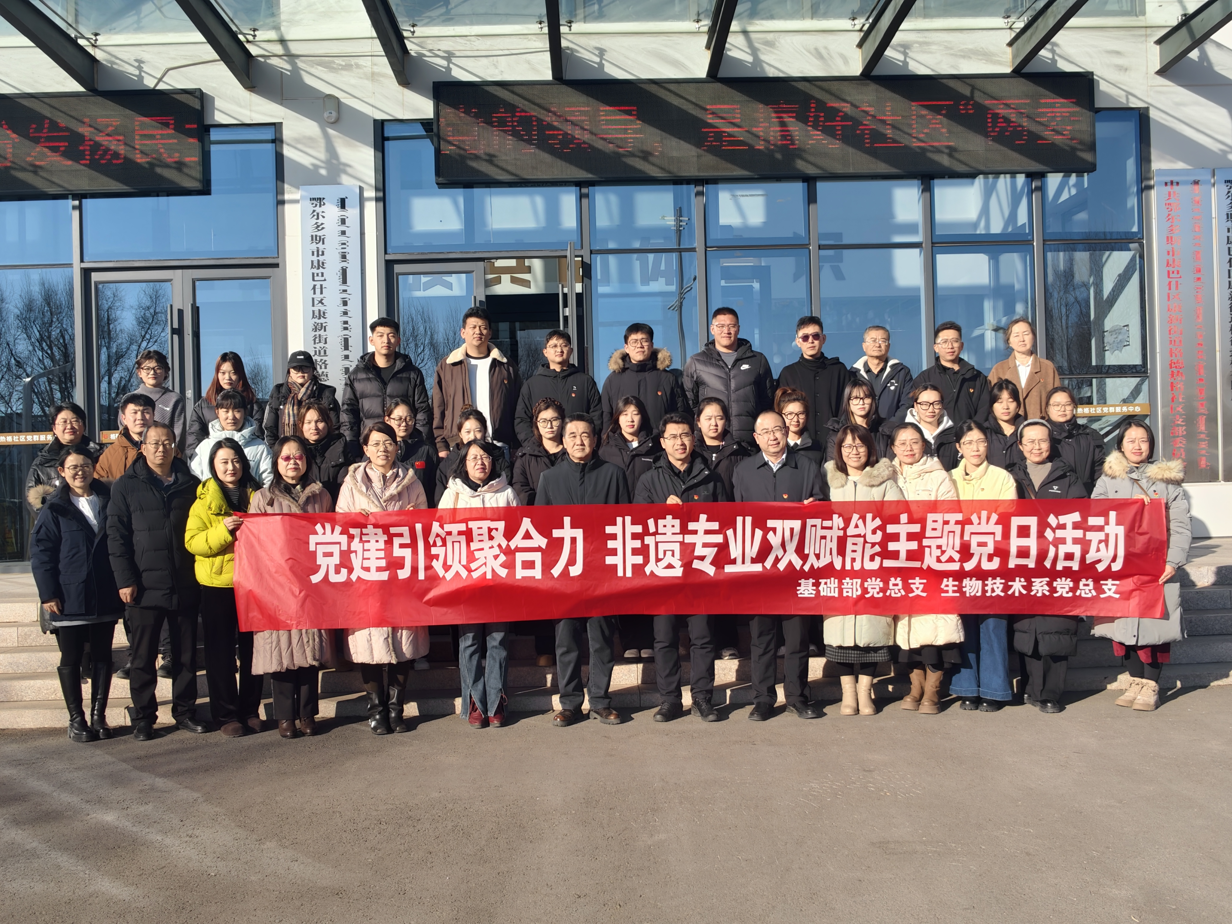 为深入推进党建与业务工作深度融合,丰富基层党建活动形式,近日,我院基础部党总支、生物技术系党总支前往康巴什区康新街道格德热格社区党群服务中心,联合开展“党建引领聚合力,非遗专业双赋能”主题党日活动。院党委委员、副院长贾利民同志参加活动。