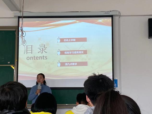 宝晓老师首先发言,让同学们总结上个学期末布置给同学们的学习任务。通过总结让我们知道了只有努力才是我们学习路上必胜的关键!宝老师对假期学习提高记录做出评价,表扬了完成情况优秀的同学,告诫不认真的同学。老师再三强调我们是学生,我们最大的任务就是学习。在学校,我们应该要做到学习工作两不耽误,希望我们可以合理去安排时间,在休闲之余也能提高学习效率和工作的质量。我们的一言一行一举一动都是代表着大学生,所以无论什么事我们都要讲究礼仪,世上无小事,办好小事才能做大事。