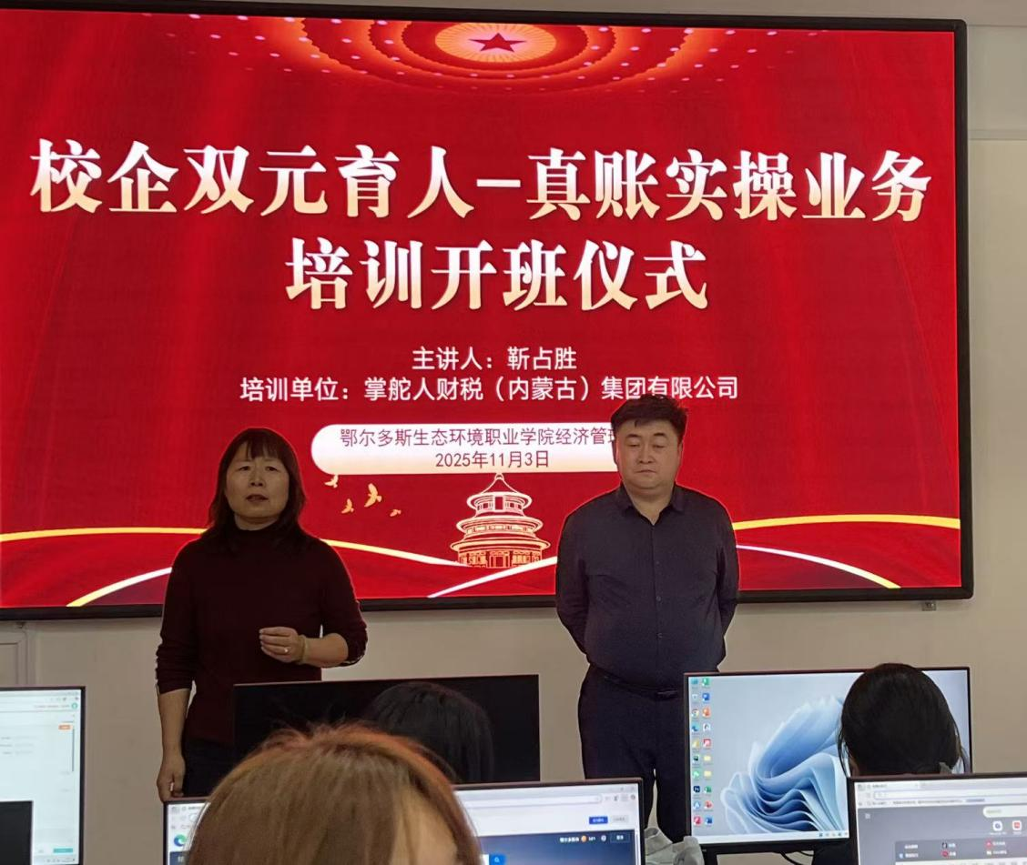 为提升大数据与会计专业学生实践能力,帮助学生熟悉真账实操工作场景,实现会计理论与岗位实践的深度融合,11月3日至7日,经济管理系特邀掌舵人(内蒙古)财税有限公司负责人靳占胜作为主讲人,在机房402室成功举办了“校企双元育人”真账实操业务培训,为学子们搭建了从“课堂”到“职场”的实战桥梁。