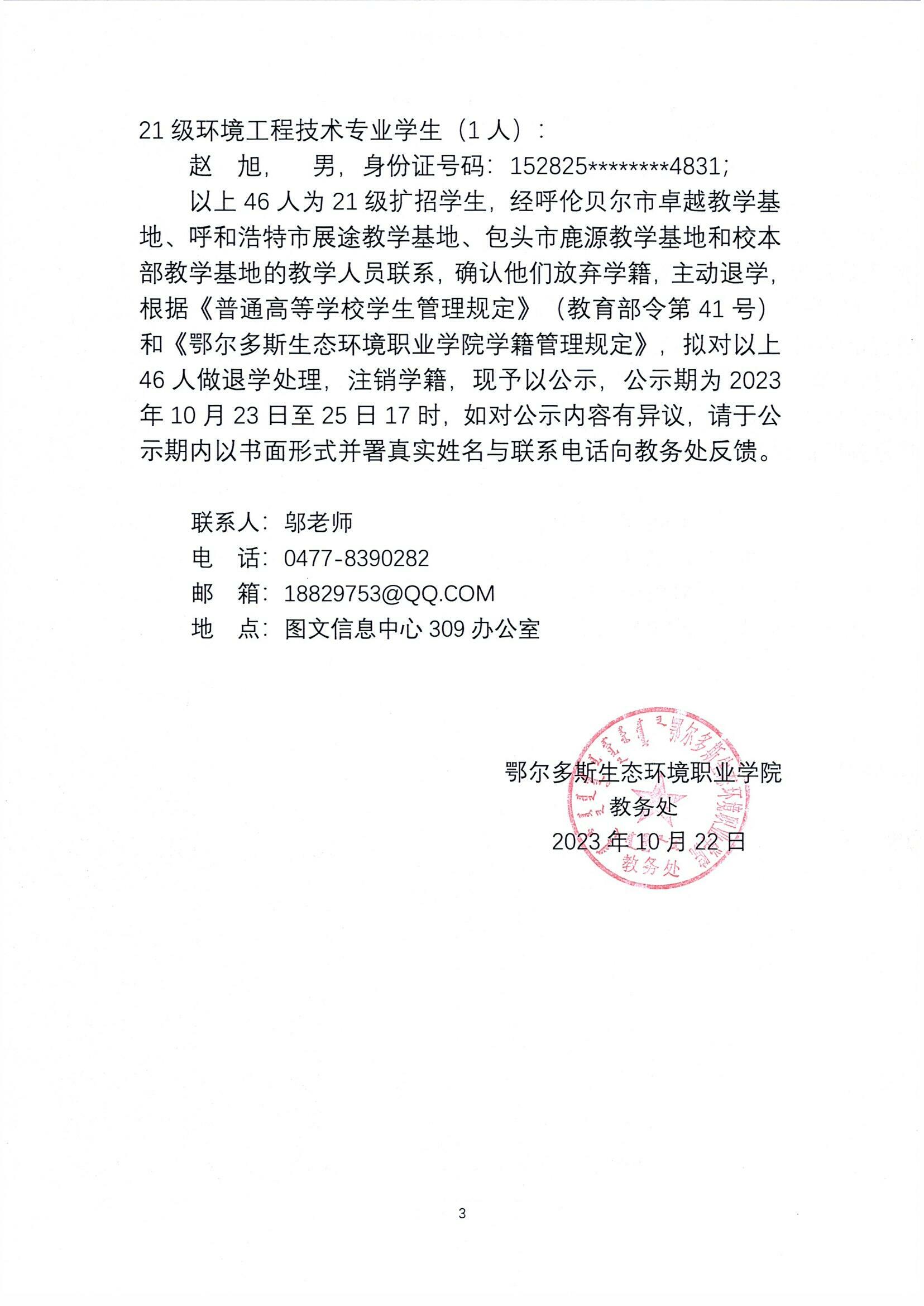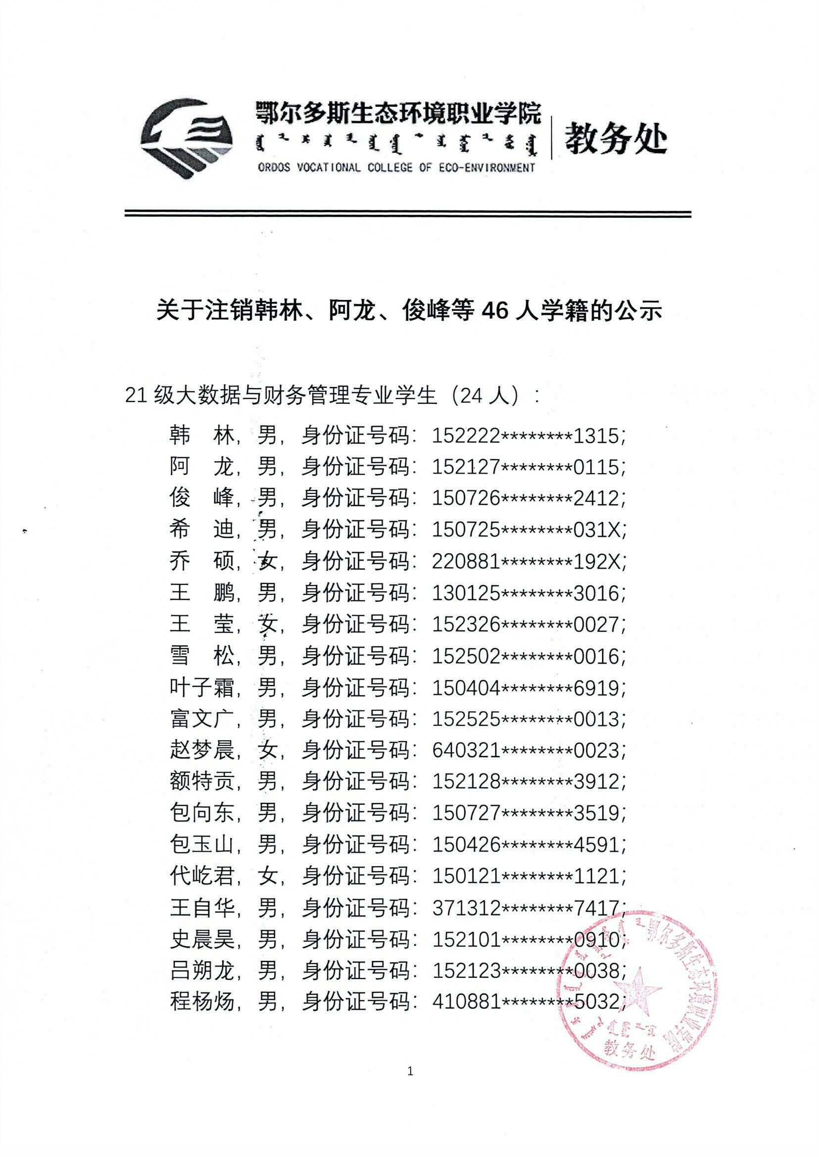 关于注销韩林、阿龙、俊峰等46人学籍的公示