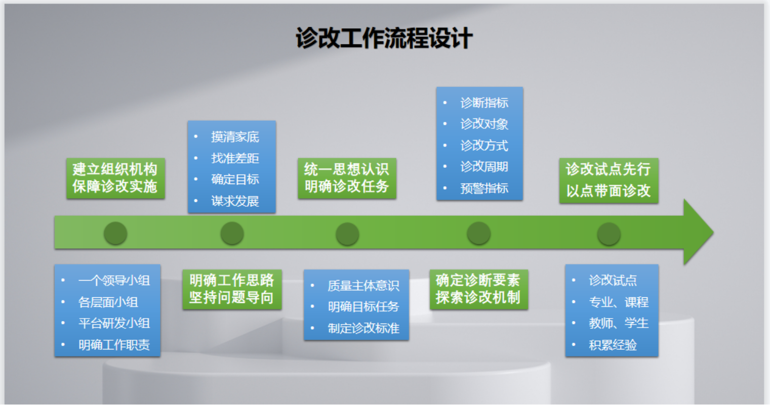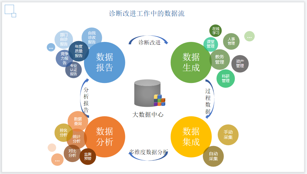 依据学院办学理念、办学定位、人才培养目标和内部质量保证体系建设方案,聚焦学院人才培养工作和教育改革,以持续提升人才培养质量为学院工作核心。我院围绕内部质量保证体系诊断与改进,建设内部质量诊断与改进信息化平台,纵向重点打造目标链、标准链,横向重点构建质量改进螺旋。紧抓事前、事中、事后三个环节,在学院、专业、课程、教师、学生五个层面以目标、标准为切入点,以问题为导向,数据为支撑,按照“常态纠偏、阶段改进”“8 字螺旋”实施自主诊断与改进;按照强基础、融数据、造流程、塑画像的建设路径,加快高质量数字校园建设步伐。
