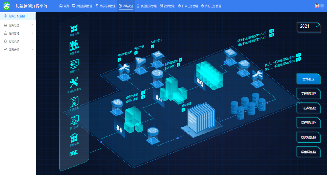 1.质量监测分析平台:根据学院情况,我院已完成五横层面的质控点及目标、标准体系的分析及设定,支持目标、标准体系的动态调整。根据学院实际运行情况,设定任务管理系统,完成学院所有任务过程的监管,多手段推送预警信息;智能生成各个层面的诊改报告和质量年报;支持五个层面的画像分析;支持向移动端推送诊改报告。