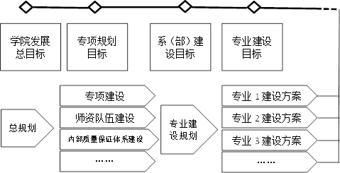 依据学院“十三五”发展规划,编制“十三五”专业课程建设规划、师资队伍建设规划、学生发展规划、社会培训服务规划、教科研建设规划、党建和思想政治工作规划、校园文化建设规划、内部质量保证体系建设规划和信息化建设规划专项规划。各教系(部)依据学院“十三五”发展规划和各专项规划,编制系(部)专业(课程)建设规划。各专业、课程根据规划,编制建设方案,明确建设目标、任务、措施、预期效果,形成学院规划与系(部)规划目标体系(图4)。
