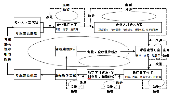 专业团队负责专业质量的自我诊改工作,编制专业建设方案、专业教学标准、课程标准(也可用教育部标准)、人才培养方案等,统筹课程教学标准的制定,进行市场需求调研、学生思想文化素质分析、学业情况分析、能力测评情况分析,参考毕业生跟踪调研数据及用人单位满意度数据,开展自我诊改,撰写专业建设与教学质量报告。